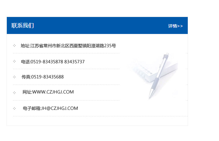 地址:常州市新北區友邦商務大廈1幢16、17層  電話:0519-85101652  傳真:0519-85112595  郵編:213022  網址:www_cz-jiayue_cn.hnzthb.com  郵箱:xiajifengaa@163.com